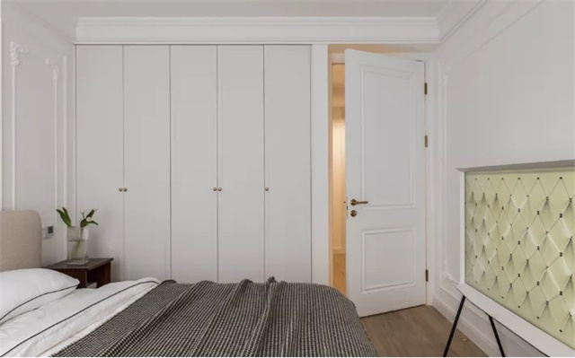 主卧延续简约舒适风格,雅白墙面装饰PU线条和精致角花,与白色踢脚线融为一体,空间视觉统一性更强。