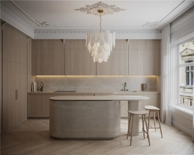 厨房多被设计开放式,并配备岛台和吊柜