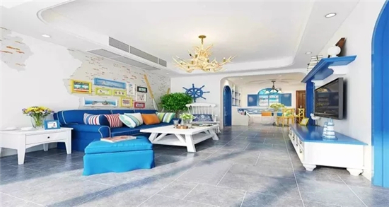 地中海民族风的客厅装修,家具都是白色的,搭配蓝白的软装,抢眼的沙发墙是梦幻的星空,仿古的灯具与风扇,色彩绚丽的同时透露出惊人的简洁。不用说了,设计师很厉害。