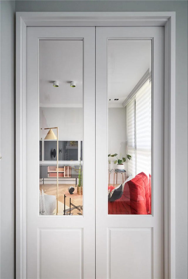 沙发墙后的玻璃门后,是书房区域,玻璃门让空间独立的同时,视觉更加通透,让采光得以共享。