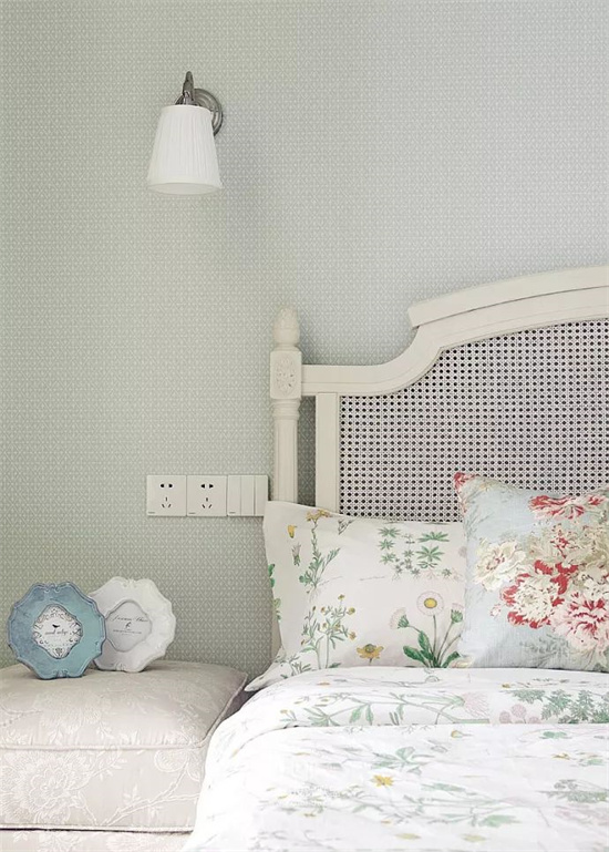 美式风格的墙纸图案没有太多限制,色彩上可以鲜亮为主,不太选择暗色调。图案、色调的选择同样很多,主要根据卧室的整体装饰而定,经常出现的是碎花图案的墙纸。