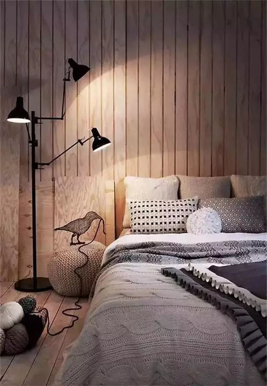 北欧风格卧室特征:简约、颜色以黑白灰为主,整体追求线条的简约、经常运用原木元素和不规则几何元素。选择背景墙时要符合北欧风格的特征。